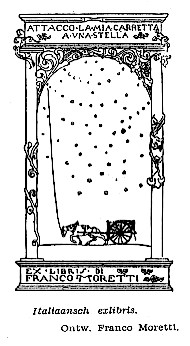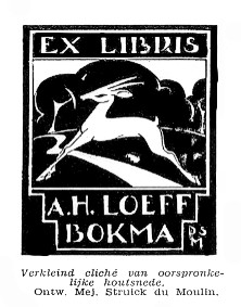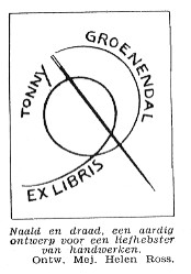 Erger is het, dat men exlibris tegenwoordig niet alleen meer laat maken om in zijn boeken te plakken, maar om ze te kunnen ruilen met anderen. Een soort schertsartikelen derhalve; zoo laat men eenzelfde cliché in 5 kleuren afdrukken en meent dan ook 5 exlibris te bezitten. Het is jammer, dat deze fijne hoogstaande kunst, die aan zulke speciale eischen moet voldoen, tot zulke excessen heeft geleid.