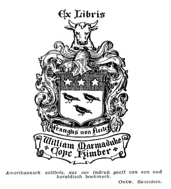 Tegen den regel, dat het boekwerk den naam van den eigenaar draagt, wordt voortdurend meer gezondigd. Dat is jammer, want het verliest dan iets essentieels; initialen kunnen wel mooi zijn, maar zeggen te weinig. Het doel is nu eenmaal: duidelijk te laten lezen, wien het boek toebehoort, in de hoop dat de vreemde bezitter het dan zal terugbrengen. Of het altijd geholpen heeft? Niemand zal deze vraag bevestigend durven beantwoorden; er zijn zelfs wel boeken die nooit terugkwamen, omdat er zoo'n mooi exlibris in zat.Het oudste Europeesche exlibris is Duitsch en stamt uit het einde der 15e eeuw, terwijl het oudste Nederlandsche, dat van een jaartal voorzien is, dateert van omstreeks 1590; het is van een vrouw en berust in het Britsch Museum. Alleen de aanzienlijken nu, die boeken hadden, veroorloofden zich de luxe van een exlibris, dat dan meestal uitsluitend bestond uit een voorstelling van het familiewapen, met of zonder spreuk, uitgevoerd als houtsnede, later als gravure. Het is bijzonder aardig in een oud boek zoo'n gravure te vinden van een familiewapen en daaronder een ander exlibris, dat, zooals uit de heraldische voorstelling blijkt, van een voorvader van den lateren bezitter afkomstig was.